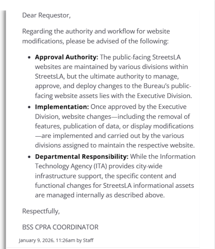 Public records requests to the Los Angeles Information Technology Agency (ITA) confirmed a critical fact. Although ITA provides the infrastructure hosting departmental websites, it does not control what information is published. The ITA stated that executive leadership within each department retains full authority over what content is made public or removed. ITA merely enables publication by abstracting away technical barriers. This means the decision to remove special events permits from public view was made at the executive level of the Bureau of Street Services.
